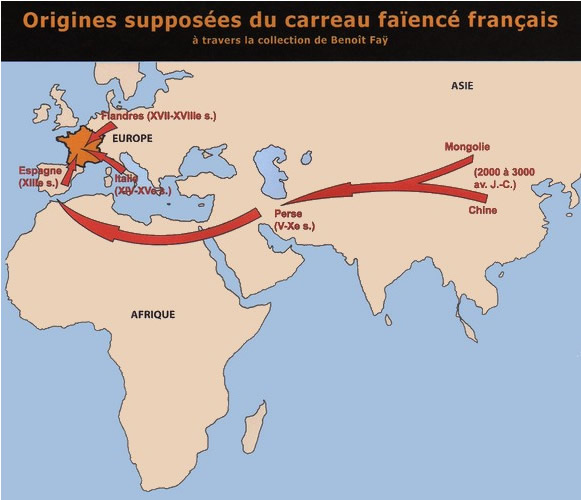 Au XIIIème, XIVème siècle, arrivée de Mongolie, à travers la Perse, le monde arabe puis l'Espagne, l'utilisation de l'oxyde d'étain, cuisant blanc, va ouvrir la voie royale à toutes nos fabrications de faïences, de vaisselles, de pots divers, et à nos petits carreaux.